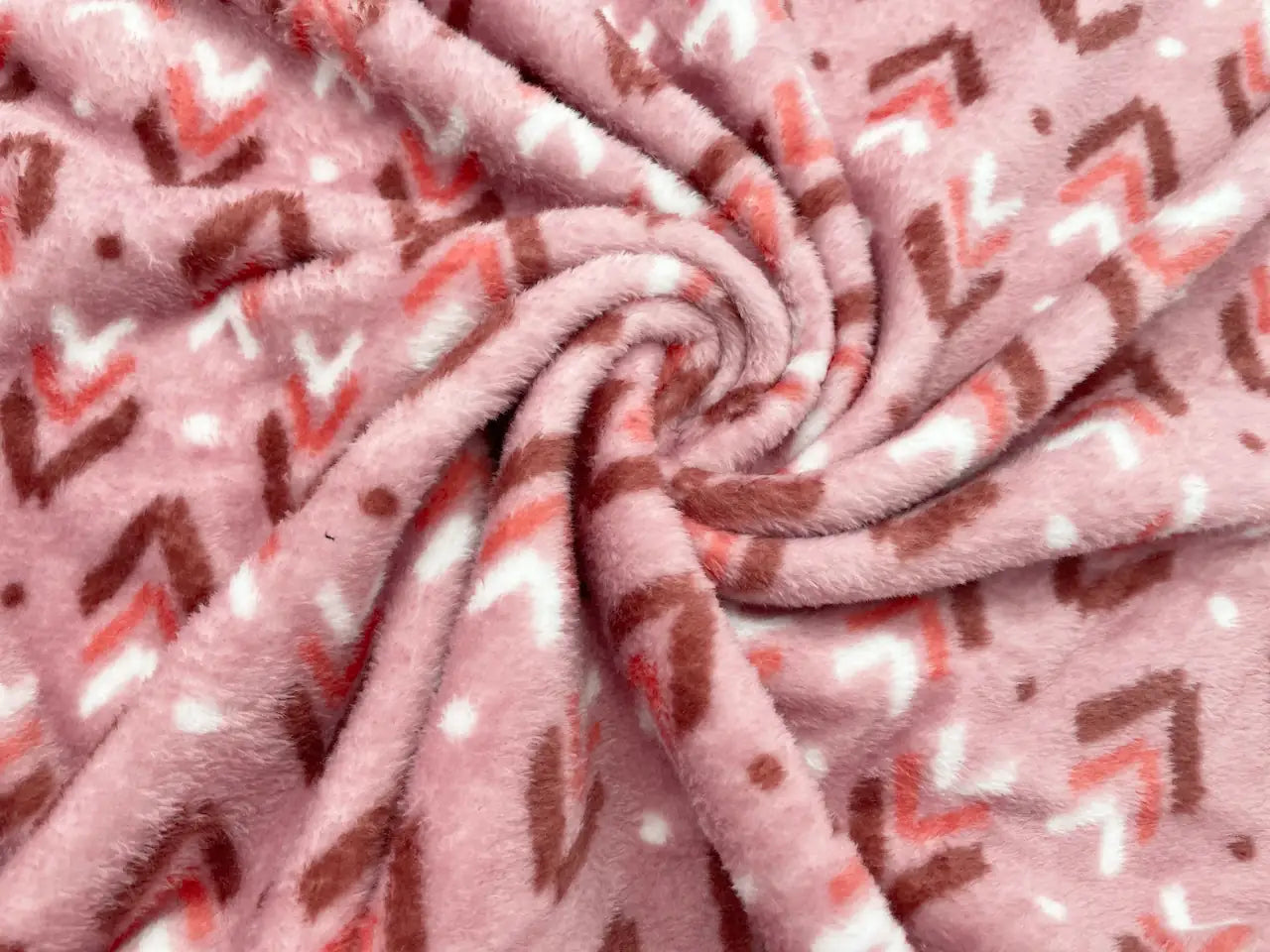 Kuscheliger und wundervoll weicher Flanell Fleece hier mit Pfeilmuster in Braun, Rot und Weiß auf Altrosa Grund.